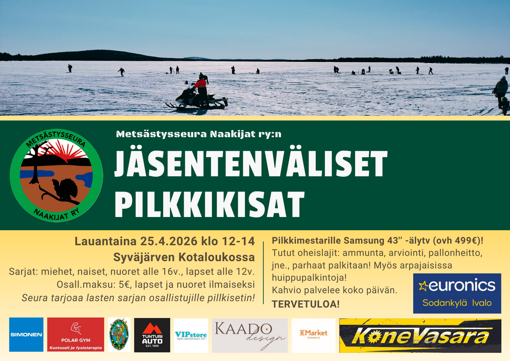 Metsästysseura Naakijat ry:n jäsentenväliset pilkkikisat pidettiin lauantaina 25.4.2026 aurinkoisessa säässä Syväjärven Kotaloukossa. Koko huhtikuun ajan oltiin jännitetty, päästäänkö pilkille ollenkaan vai joudutaanko jäiden katoamisen vuoksi vaihtamaan kisalaji rannaltaongintaan. Onneksi jäitä nyt vielä juuri ja juuri oli ja pilkkikansa uskallettiin jäälle päästää. Kala vain ei oikein ollut kisapäivänä syönnillään ja 32 pilkkijän yhteissaalis oli vain pikkuisen vajaa 7,5kg. Yhteenlasketusta normaalisaaliista jäätiin siis toistakymmentä kiloa.
