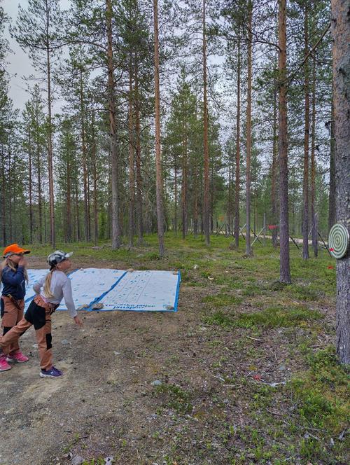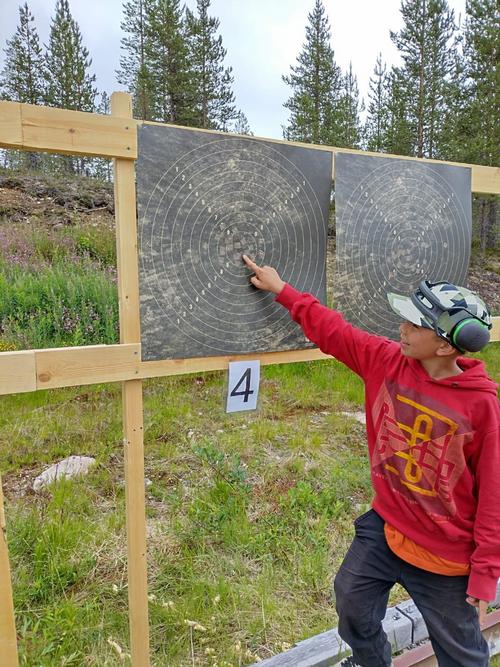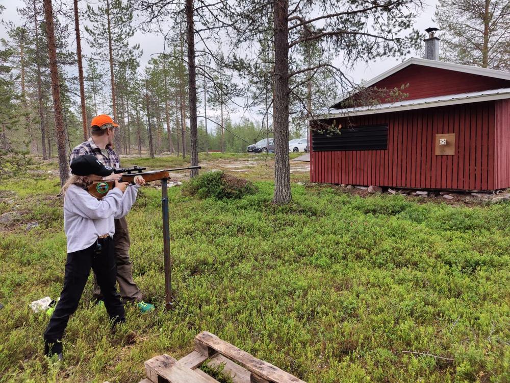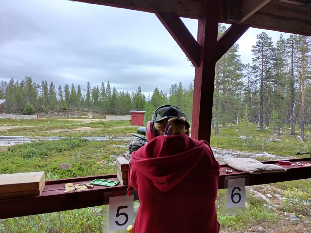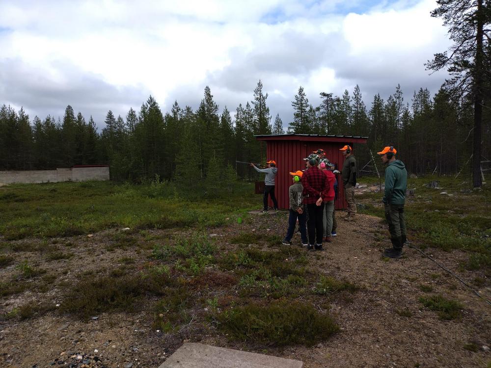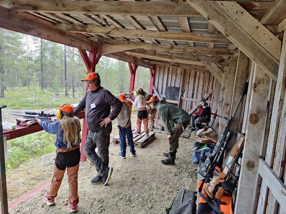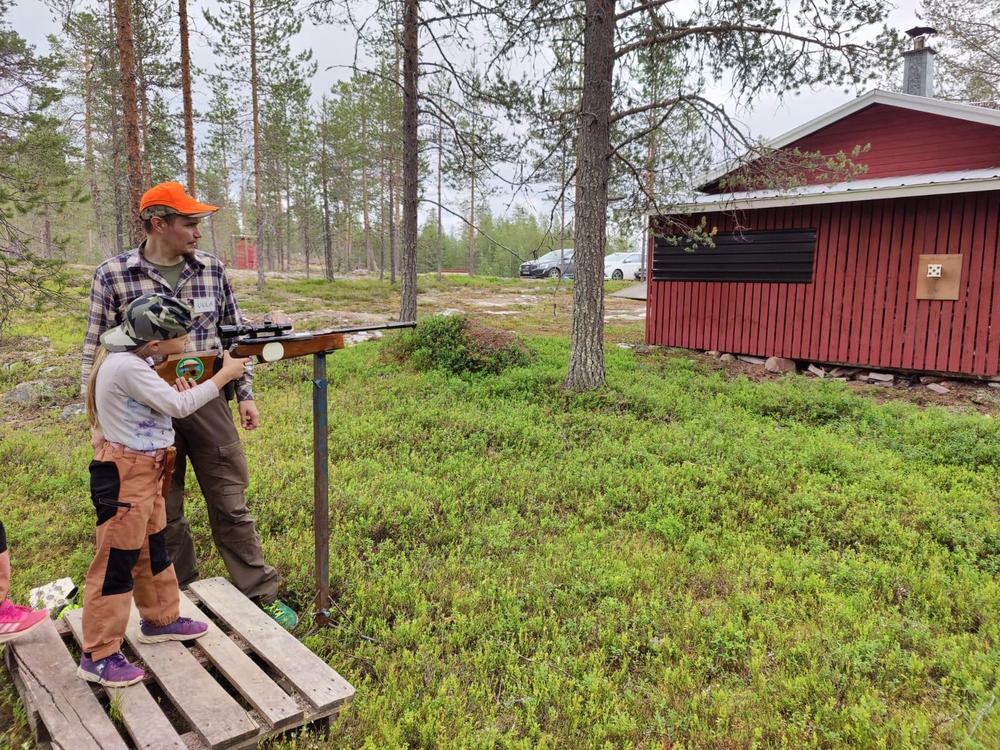 Perjantain ykkösrastilla oli ohjelmassa ammuntaa erilaisilla kivääreillä, pienoiskivääreillä, metsästyskivääreillä ja rata-aseilla. Ensin kuitenkin käytiin läpi aseenkäsittelyn ja ampumaratakäyttäytymisen perusteet, turvallisuus kaiken lähtökohtana. Rastilla jokainen sai Sakari Koivuperän ja Teemu Ankkurin hyvässä opastuksessa ampua haluamallaan aseella viidellä kierroksella viisi laukausta kerrallaan. Halutessaan sai kokeilla myös eri asennoista ampumista, esimerkiksi makuulta. Montaa napakymppiä ja jopa viiden kympin kasoja saatiin esitellä ja porukalla ihastella, hämmästyttävän nopeita oppimaan olivat koko porukka!