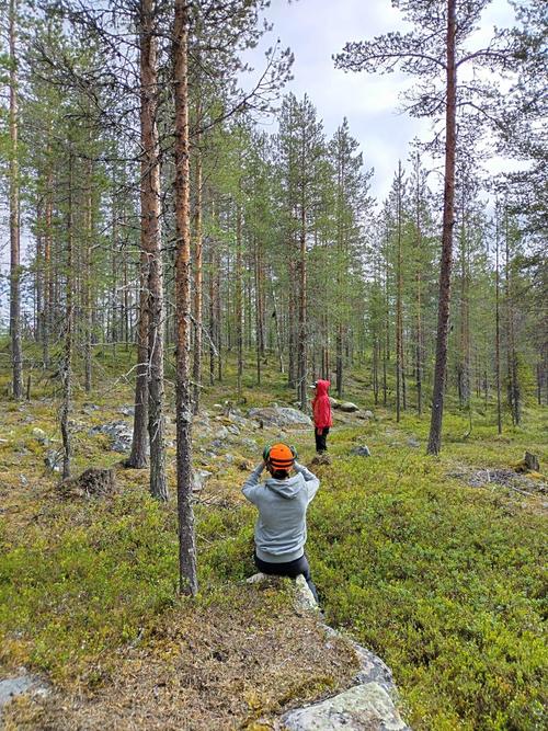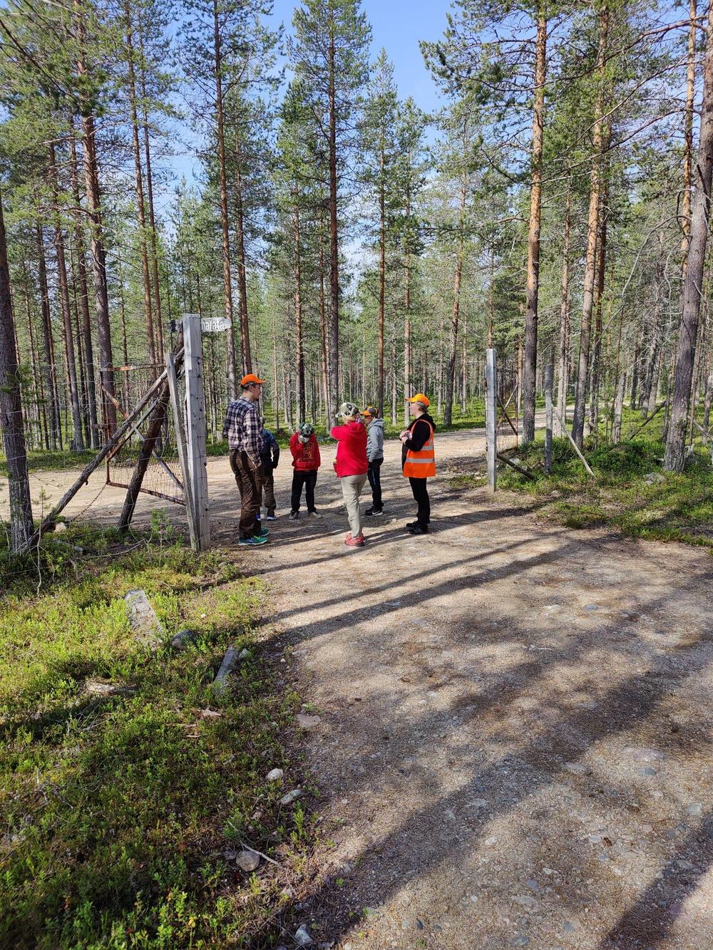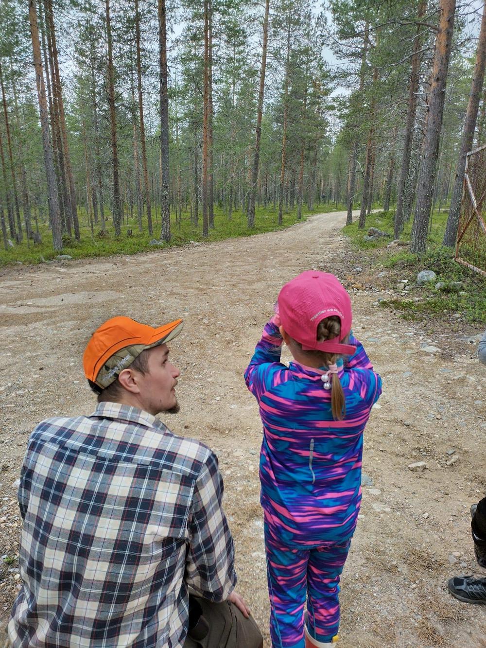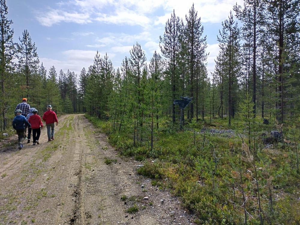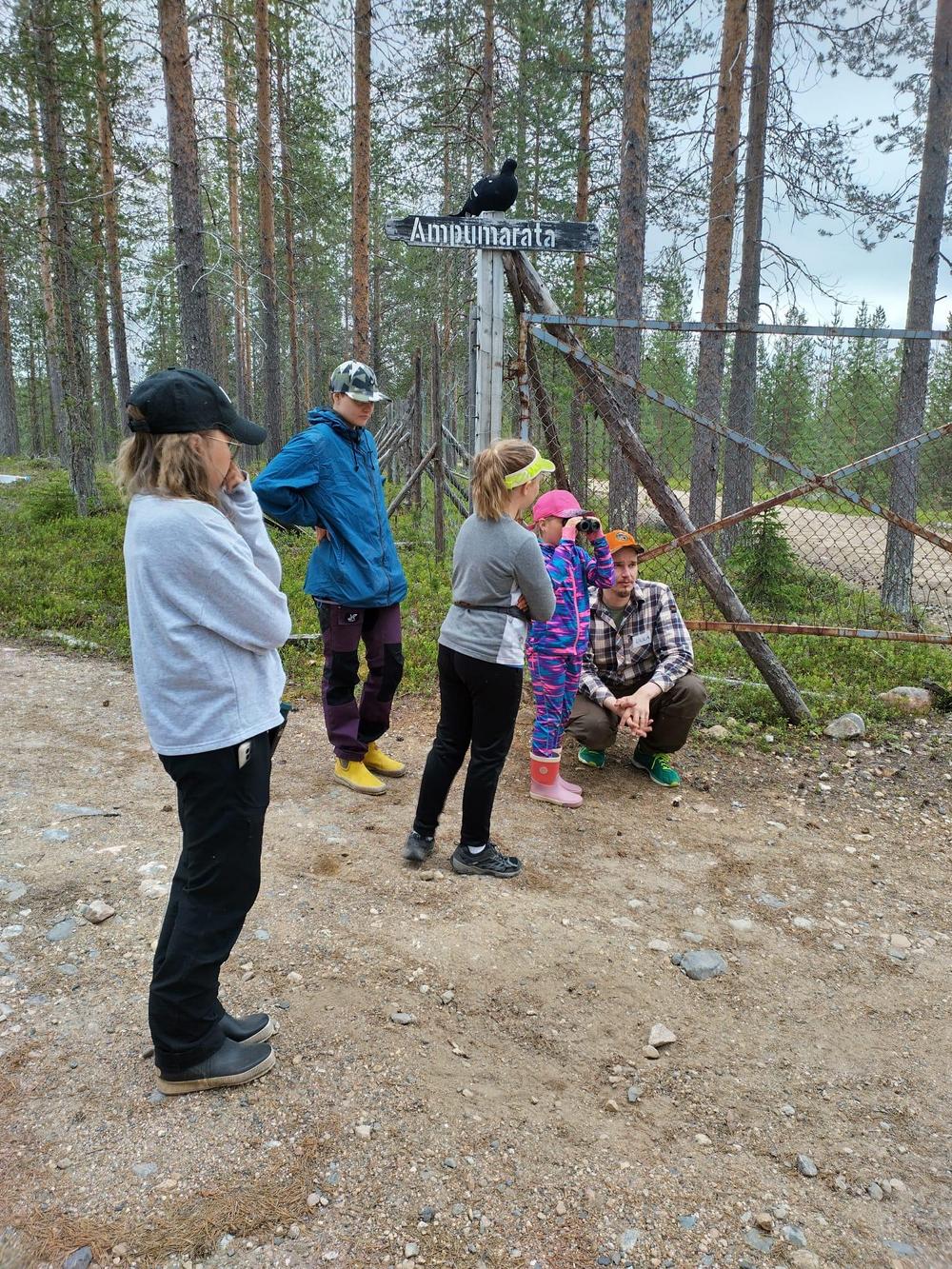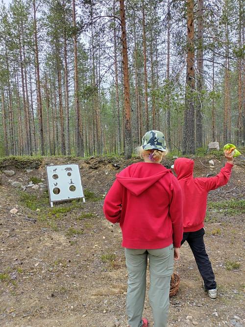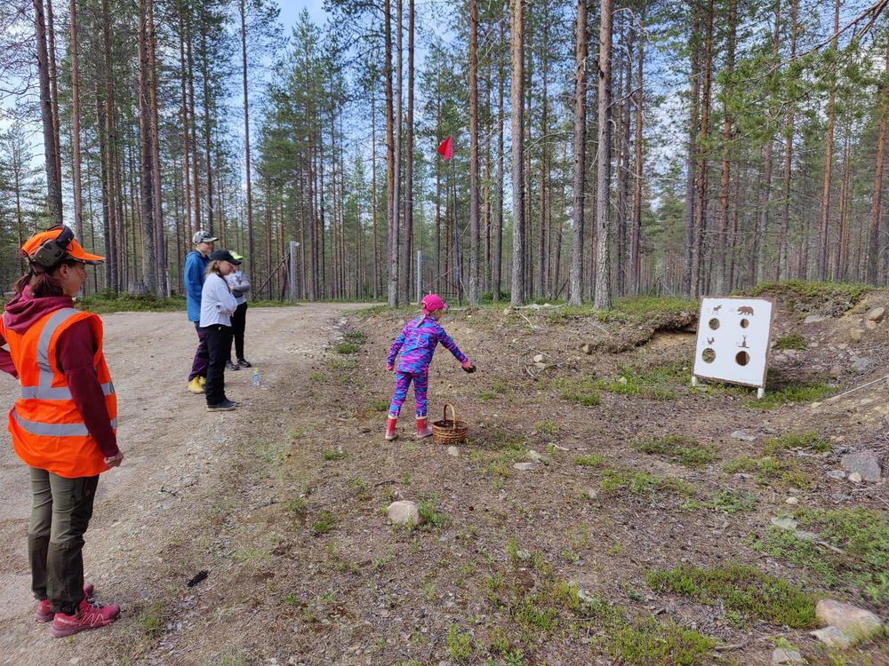 Kakkosrasti tarjosi leiriläisille kurkistuksen hirvenhölkän ja -kävelyn maailmaan. Rastinvetäjä Uula Simppala kertoi lajista ja opasti arvioinnin saloihin. Ampumaradan lähimaastoon sijoitettua neljää hirvenpäätä tutkailtiin monelta eri suunnalta ja eri etäisyyksiltä ja koitettiin arvioida matkaa. Kaikki saivat myös vuorollaan opetella käyttämään etäisyysmittaria. Etäisyysmittarilla tarkastettiin, osuiko oma arvio matkasta oikeaan tai edes sinne päin. Rastilla oli hirvenpäiden lisäksi myös pari teerenkuvaa sijoitettu maastoon havainnoitavaksi. 30 metriä maastossa hirvenpäälle näyttää kovin eriltä kuin 30 metriä puussa istuvaan lintuun. Siinä sitten mietittiin, olikohan ampumahollilla vai ei?
