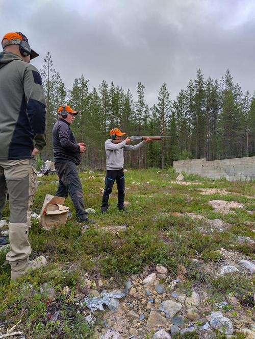 Kun kaikki ryhmät olivat kiertäneet kaikki rastit, siirryttiin vielä päivän päätteeksi tutustumaan haulikkoammuntaan. Tiiviin teho-opastuksen jälkeen kaikki halukkaat saivat vuorotellen ampua savikiekkoja ensin penkkaan ja kun haulikolla ampuminen oli tullut tarpeeksi tutuksi, oli lentävän kiekon vuoro. Ne leiriläiset, jotka eivät halunneet haulikolla vielä ampua, saivat hioa ampumataitojaan ilmakiväärin kanssa. Molemmilla ampumapaikoilla koettiin onnistumisen riemua, kun kiekot posahtelivat rajastaan rikki ja tauluihin tikattiin reikiä napakympin kohdalle.