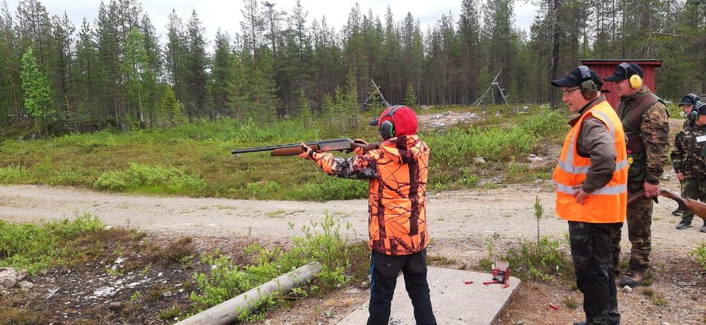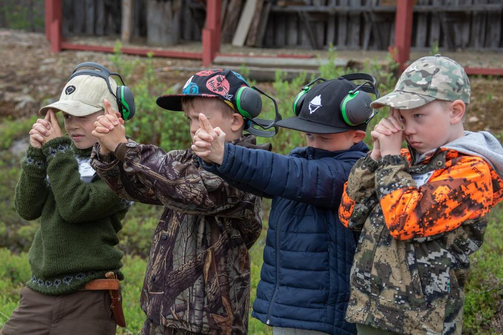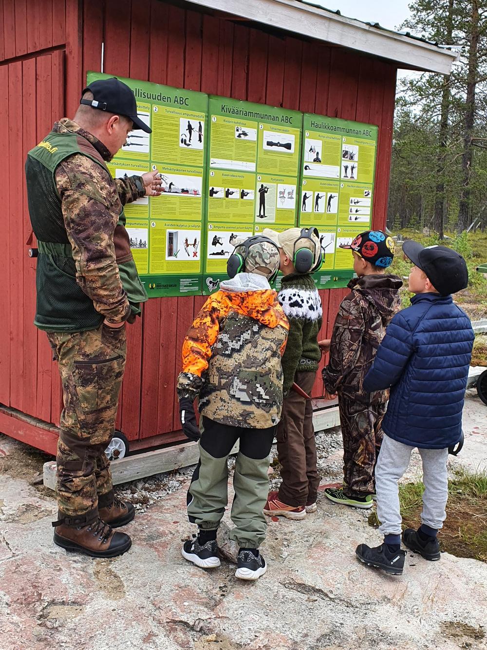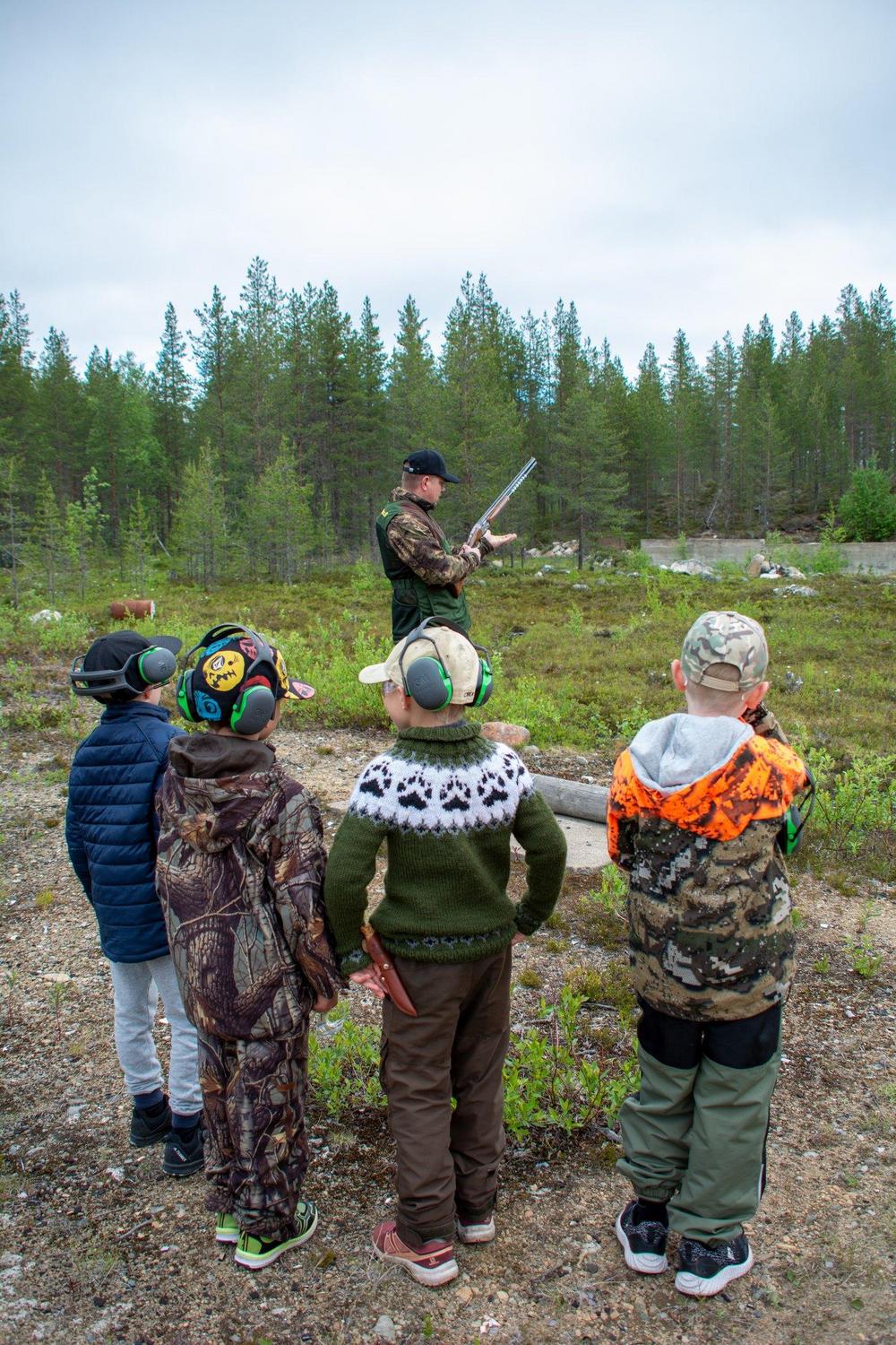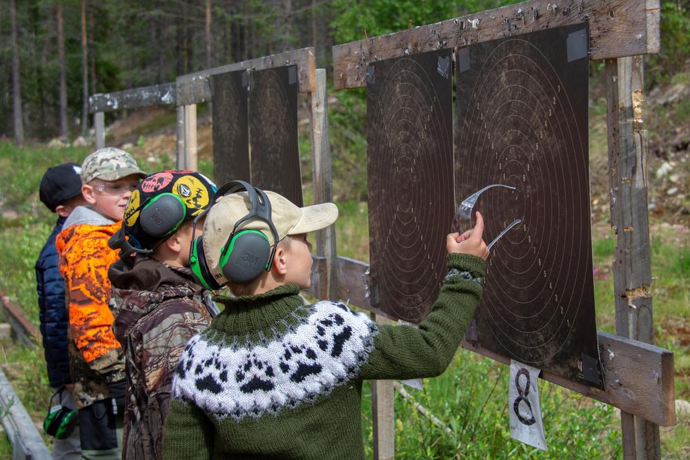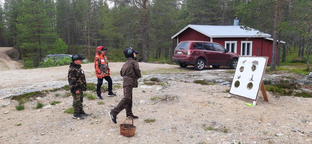 Ampumarastilla Naakijoiden Sakari Koivuperä ja Teemu Ankkuri sekä Sami Ämmälä Suomen Metsästäjäliiton Lapin piiristä johdattivat leiriläisiä ammunnan saloihin. Rastilla jokainen sai halutessaan ohjatusti ampua SAKO:n leirille toimittamilla aseilla: pienoiskiväärillä, hirvikiväärillä ja haulikolla. Osalle leiriläisistä ampuminen oli jo tuttua puuhaa, mutta toisille ampumakokemus oli ensimmäinen ja varmasti ikimuistoinen. Monelle ampumarasti olikin päivän kohokohta eikä ihme, onhan ampuminen todella jännittävää ja mukavaa hommaa olipa sitten aloittelija tai jo kokeneempi konkari. Ampumisen lisäksi rastilla mm. testattiin hallitsevaa silmää, keskusteltiin erilaisista metsästystavoista, -koirista ja -aseista ja heiteltiin kilvan hernepussia.