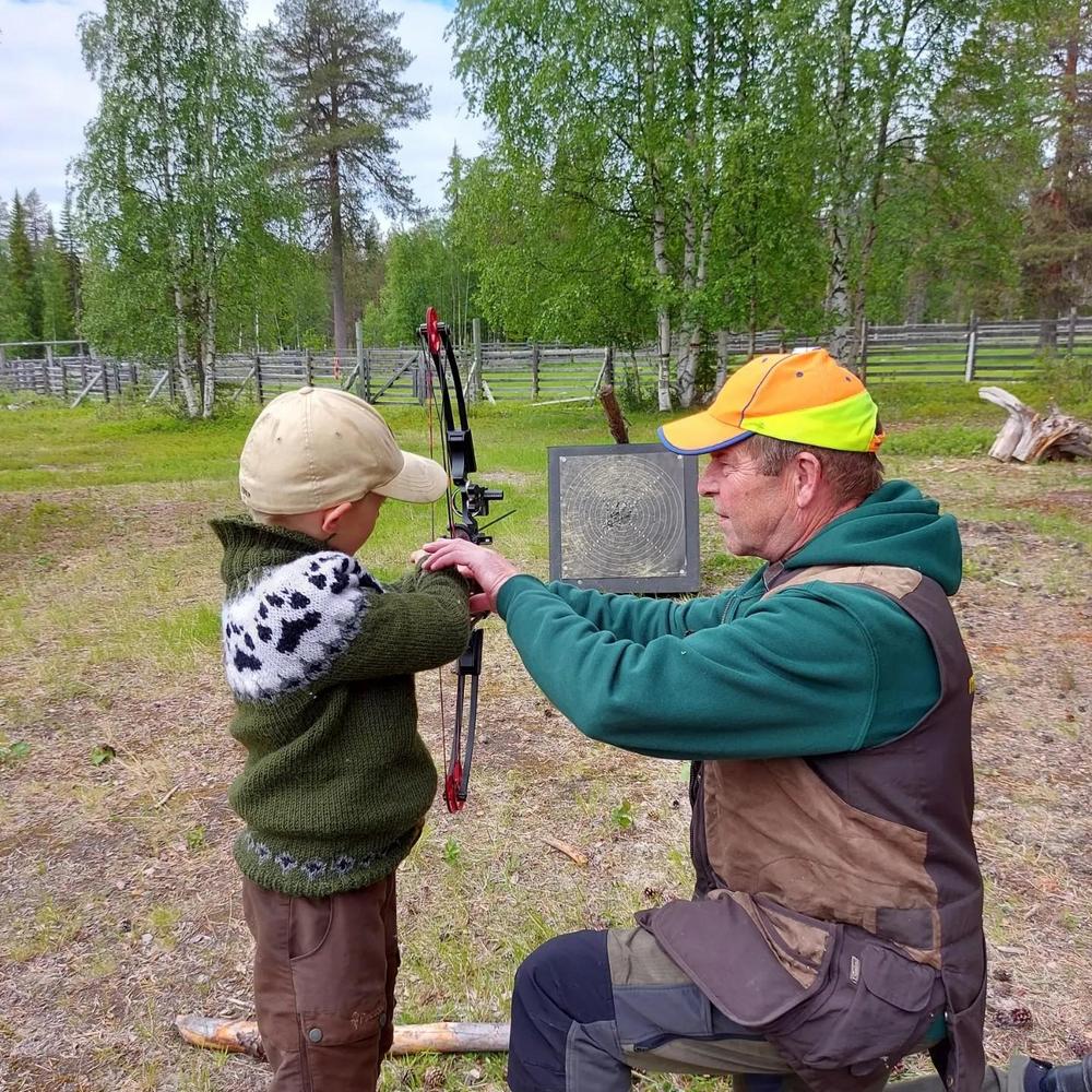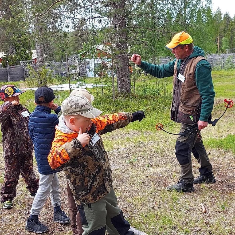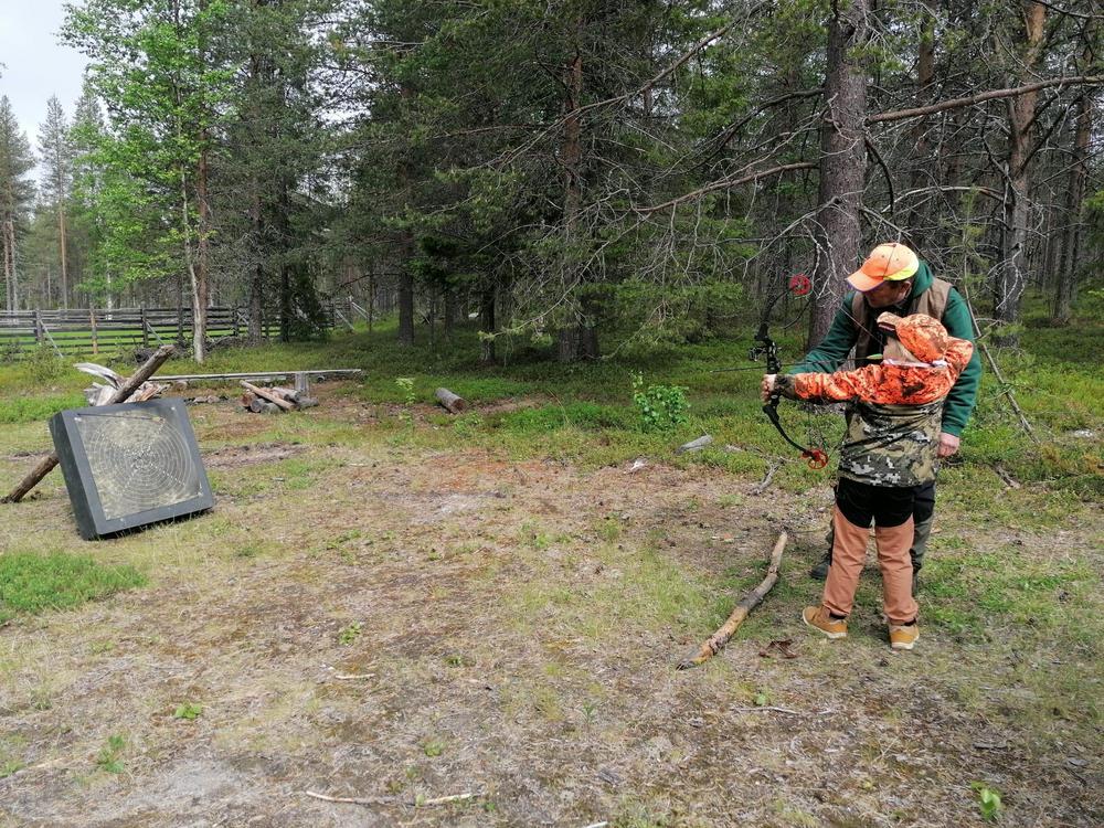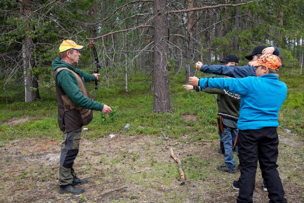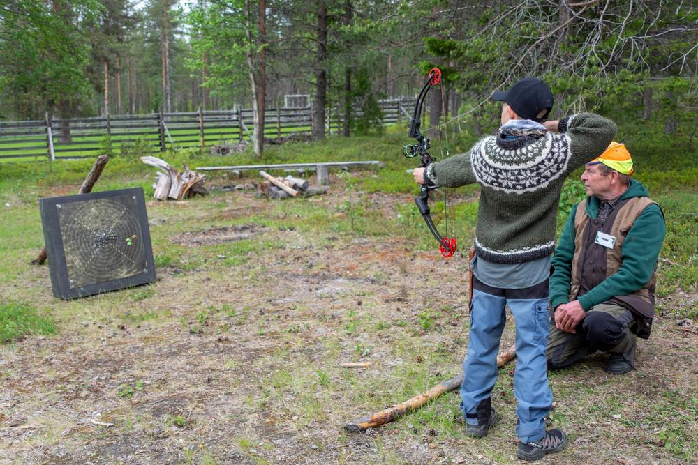 Jousiammuntarastilla opittiin mm. taljajousen osat ja jousen turvallinen käsittely, oikea ampuma-asento ja jousen jännittäminen yhdellä sujuvalla liikkeellä. Juha Haapamäki Suomen Metsästäjäliiton Lapin piiristä opasti leiriläisiä ensin aivan kädestä pitäen ja sai sitten lopuksi ylpeänä katsoa vierestä, kun nuolet napsahtelivat tauluun ja monella jopa napakymppiin!