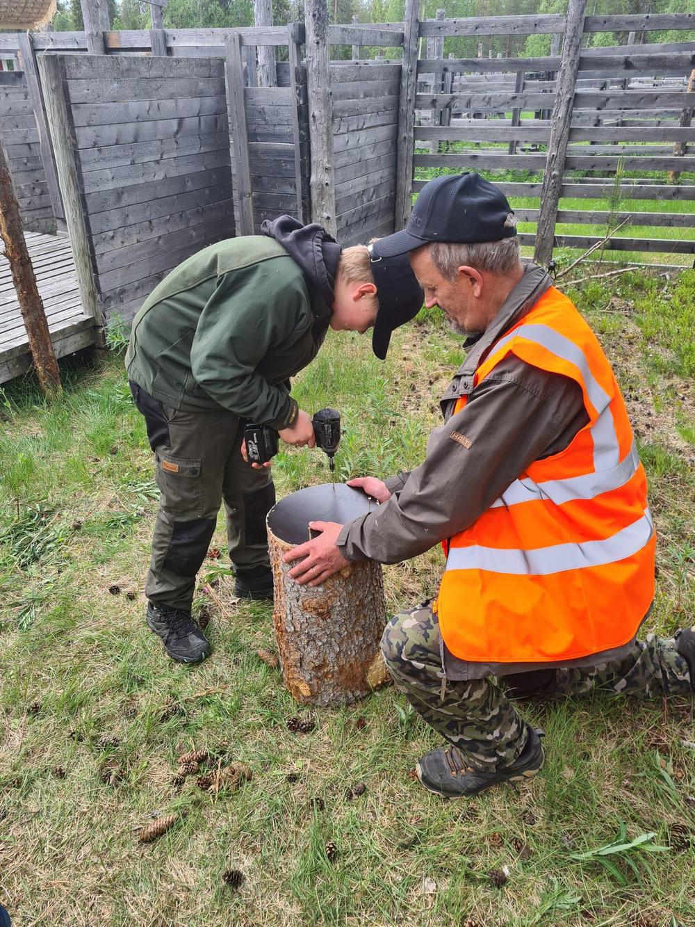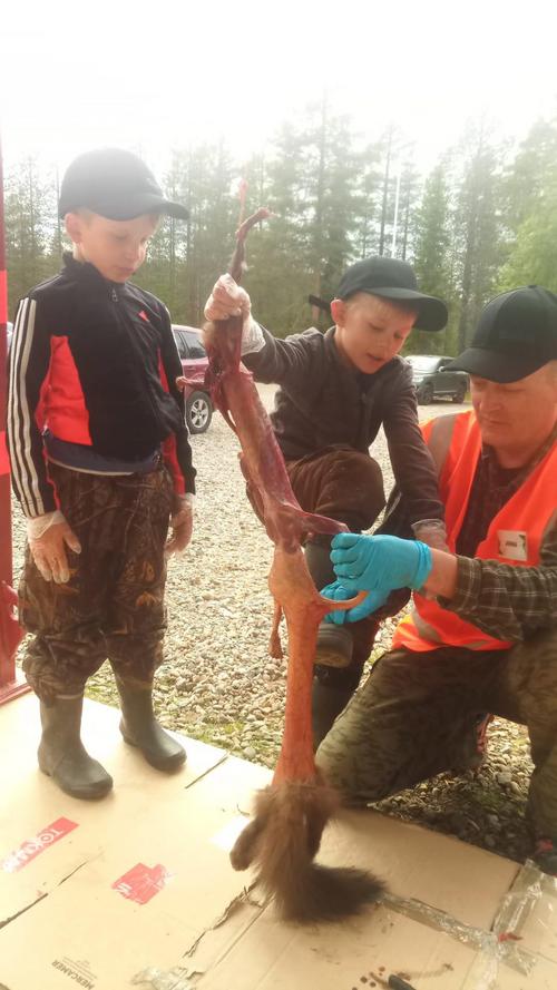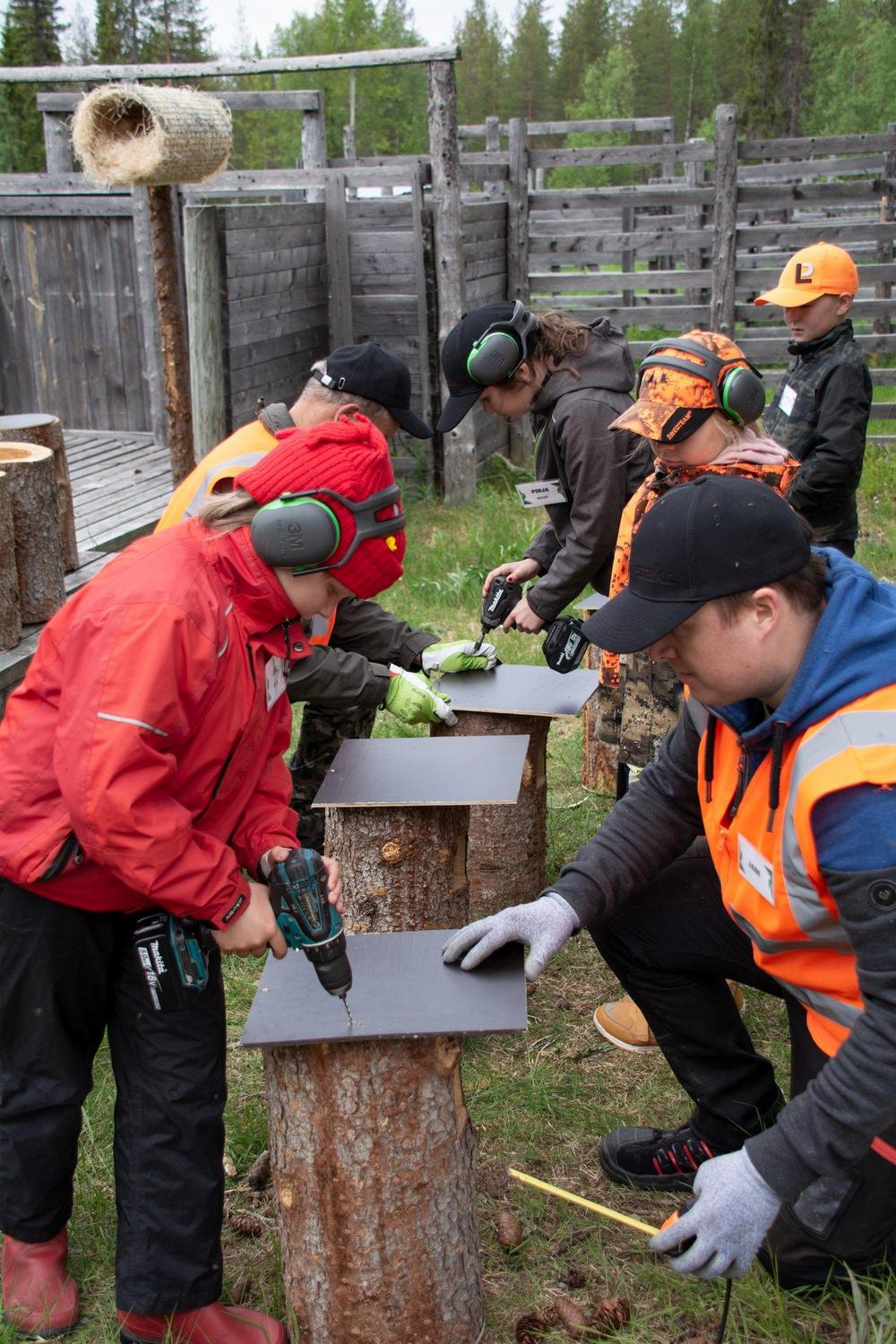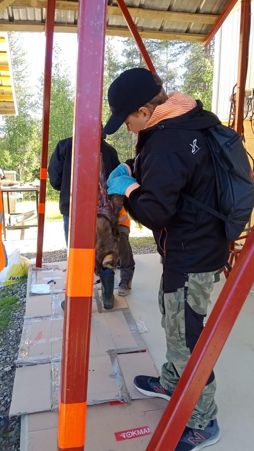 Näätärastilla Sakari Koivuperä ja Juha Kangas opastivat leiriläisiä pienpetosaaliin käsittelyyn. Jokaiselle ryhmälle oli varattu pari näätää työstettäväksi ja kaikki pääsivät omakätisesti alusta alkaen opettelemaan nylkemistä. Monelle tuli yllätyksenä, kuinka tiukassa se kultakurkun nahka joskus saattaakin olla. Kaikki kymmenen nahkaa kuitenkin lopuksi pujotettiin taanaan ja päälle saatiin ns. jälkihoito-ohjeet, mitä nahkalle tehdään myöhemmin.