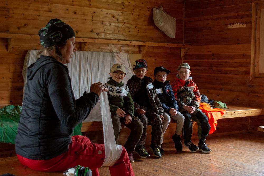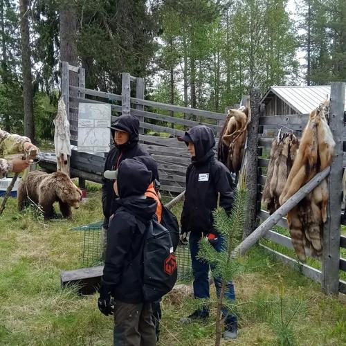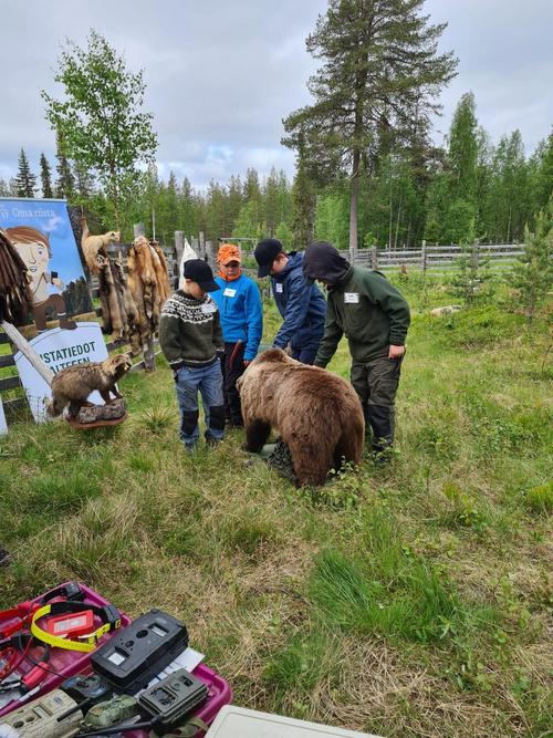 Riistarastilla Juha ja Susanna Mäkimartti Suomen riistakeskuksesta perehdyttivät leiriläisiä suur- ja pienpetojen pyyntiin. Rastilla sai rapsutella luolakoiria, hypistellä esim. kettujen ja näätien käsiteltyjä nahkoja, nähdä turkiksista tehtyjä vaatteita ja testailla erilaisia pienpetopyynnissä käytettäviä loukkuja ja ansoja. Jälkimattojen avulla rastilla myös arvuuteltiin Suomen luonnosta löytyvien eläinten jälkiä: mikä jälki olikaan ahman ja mikä karhun? Entä onko rusakolla vai metsäjäniksellä isompi jälki? Lopuksi vielä palauteltiin mieliin ilmansuunnat ja muistisäännöt, että vastaisuudessakin muistetaan lounas ja luode.