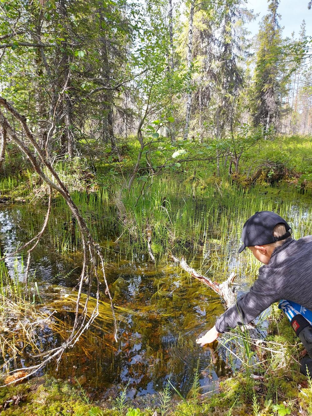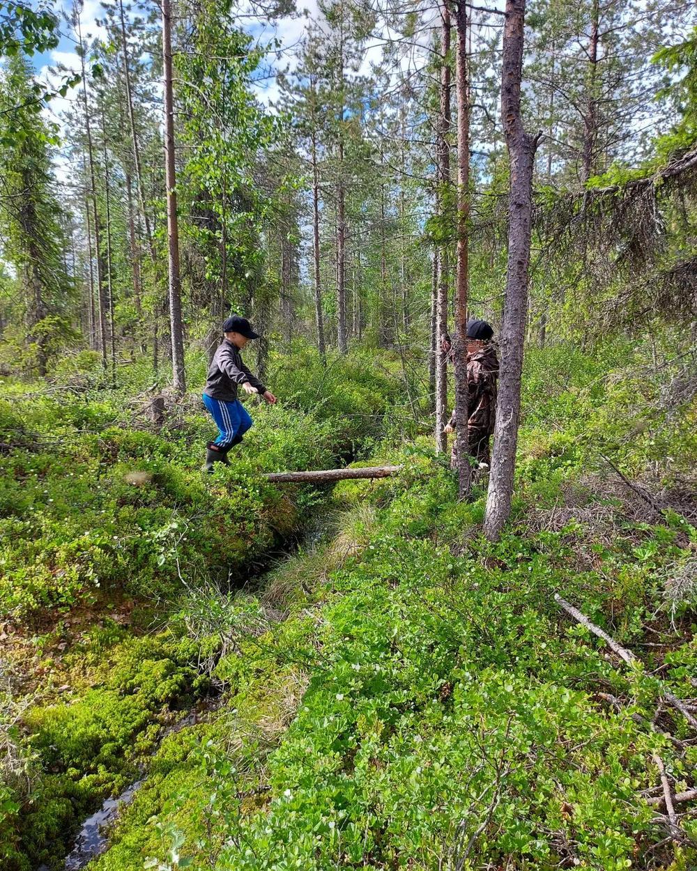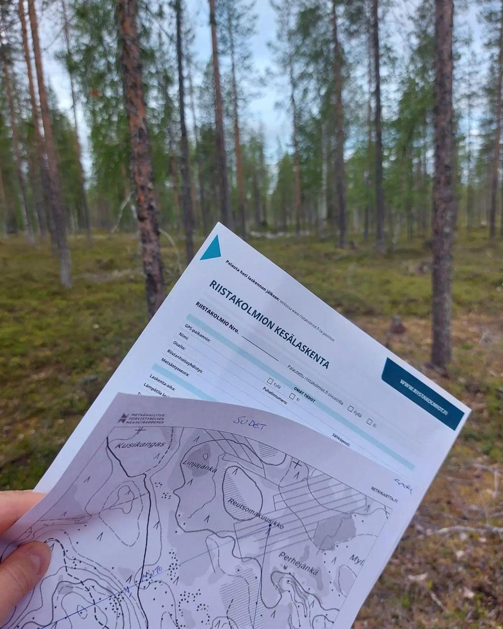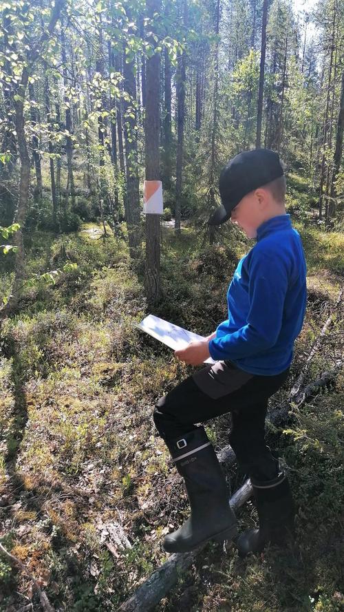 Päivän pihvi oli kuitenkin riistakolmiolaskenta. Ensin Tievatuvan salissa perehdyttiin lyhyesti riistakolmiolaskennan perusteisiin, ts. mitä, miksi ja milloin. Sitten lähdettiin maastoon kokeilemaan hommaa käytännössä. 12 km oikeiden riistakolmioiden sijaan ryhmät kävivät laskemassa 4,5 km mittaisia minikolmioita niin, että jokainen pienryhmä käveli oman kolmionsa puoliksi eli aina kaksi leiriläistä yhden aikuisen kanssa reilun 2 km. Koska ajankohta oli mikä oli, oltiin ensin hieman skeptisiä, niinköhän maastosta saadaan mitään havaintoja ja sovittiinkin, että oikeasta kolmiolaskennasta poiketen voidaan kirjata muutkin kuin vain metsäkanalintuhavainnot. Niinpä havaintolappuihin ilmestyikin kaikenlaisia kirjauksia myyristä, oravista ja poroista alkaen, mutta yllättäen myös niitä "oikeita" havaintoja: koppelopoikueita, metsoja ja teeriä. Hienosti jaksoivat pienimmätkin kävellä ja tehdä havaintoja vaihtelevissa maastoissa.