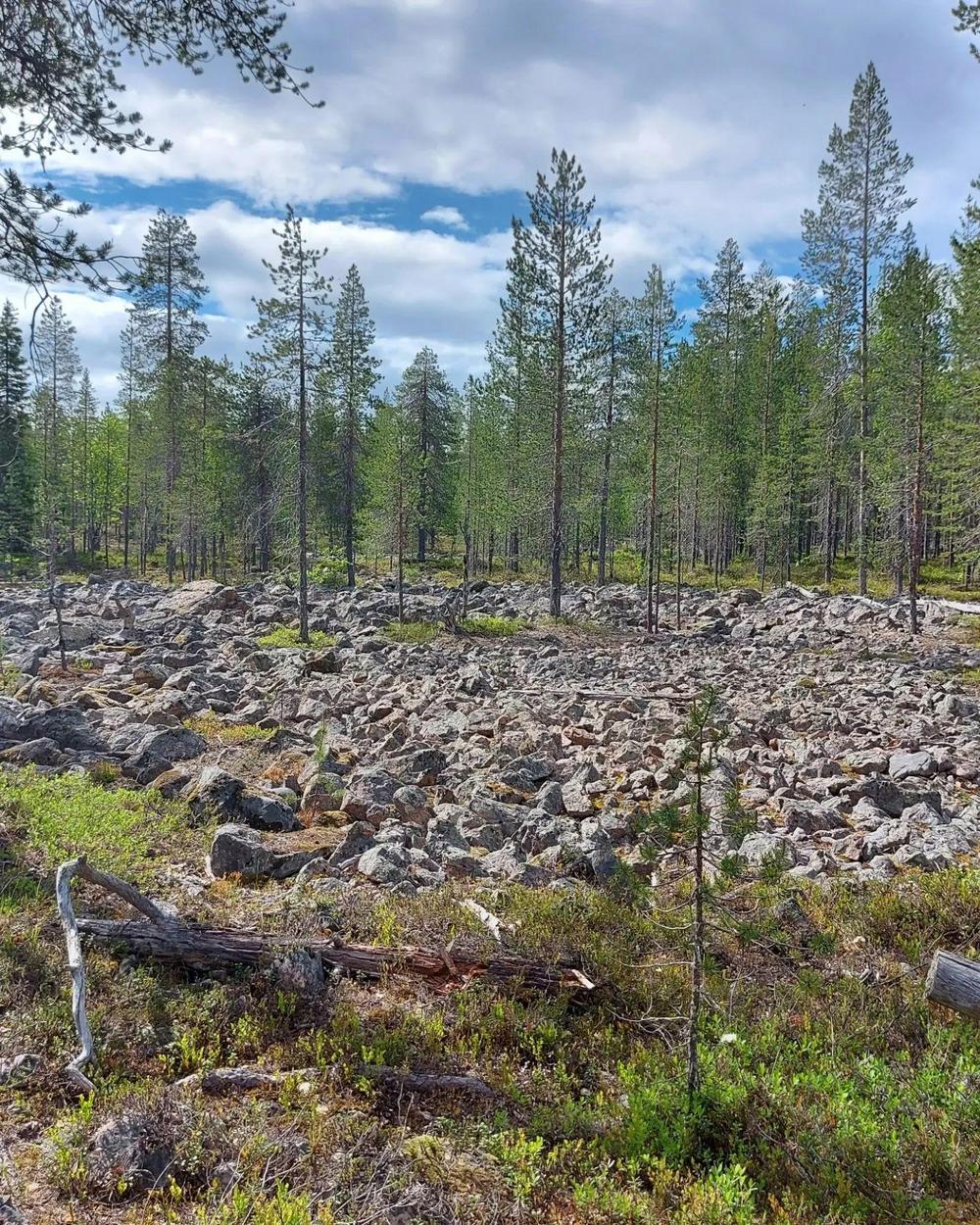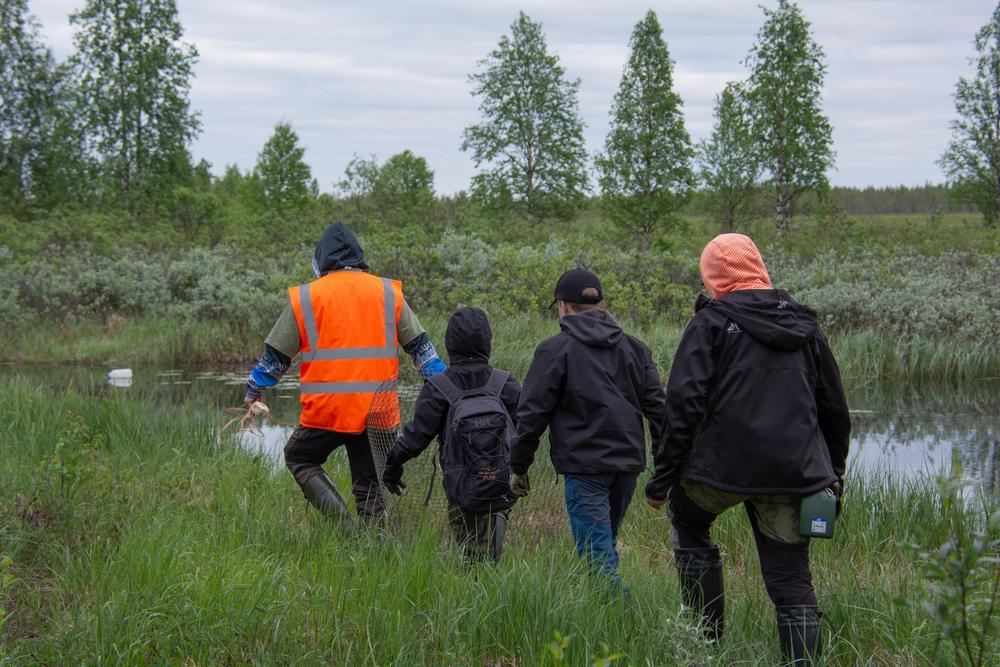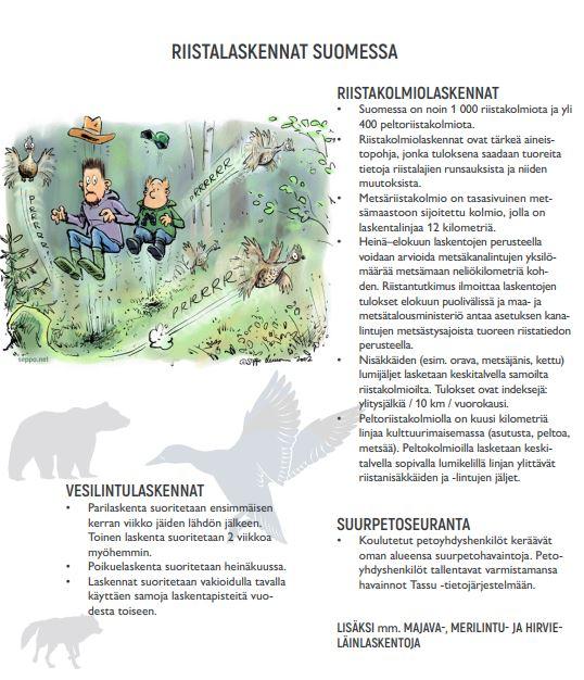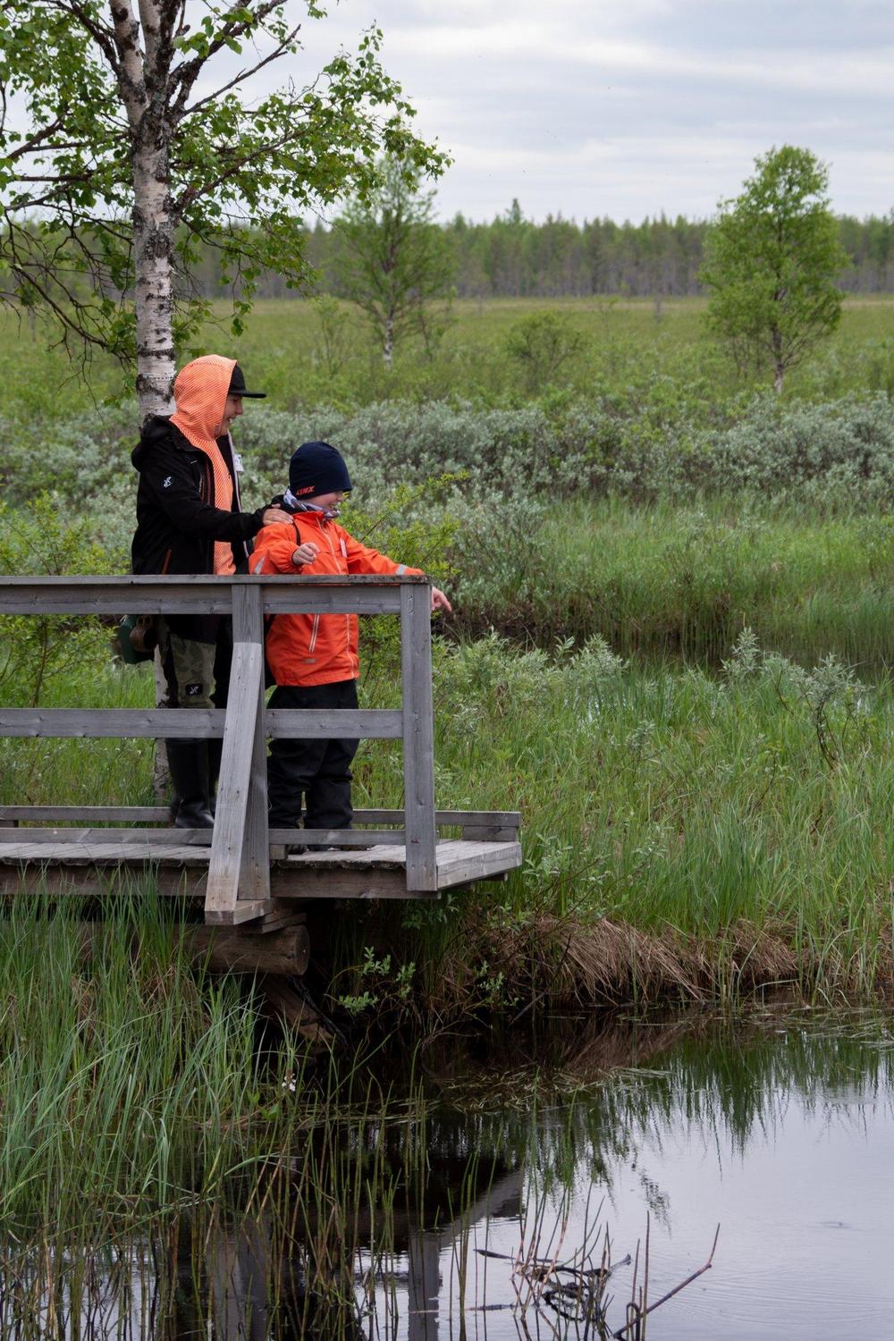 Päivän pihvi oli kuitenkin riistakolmiolaskenta. Ensin Tievatuvan salissa perehdyttiin lyhyesti riistakolmiolaskennan perusteisiin, ts. mitä, miksi ja milloin. Sitten lähdettiin maastoon kokeilemaan hommaa käytännössä. 12 km oikeiden riistakolmioiden sijaan ryhmät kävivät laskemassa 4,5 km mittaisia minikolmioita niin, että jokainen pienryhmä käveli oman kolmionsa puoliksi eli aina kaksi leiriläistä yhden aikuisen kanssa reilun 2 km. Koska ajankohta oli mikä oli, oltiin ensin hieman skeptisiä, niinköhän maastosta saadaan mitään havaintoja ja sovittiinkin, että oikeasta kolmiolaskennasta poiketen voidaan kirjata muutkin kuin vain metsäkanalintuhavainnot. Niinpä havaintolappuihin ilmestyikin kaikenlaisia kirjauksia myyristä, oravista ja poroista alkaen, mutta yllättäen myös niitä "oikeita" havaintoja: koppelopoikueita, metsoja ja teeriä. Hienosti jaksoivat pienimmätkin kävellä ja tehdä havaintoja vaihtelevissa maastoissa.