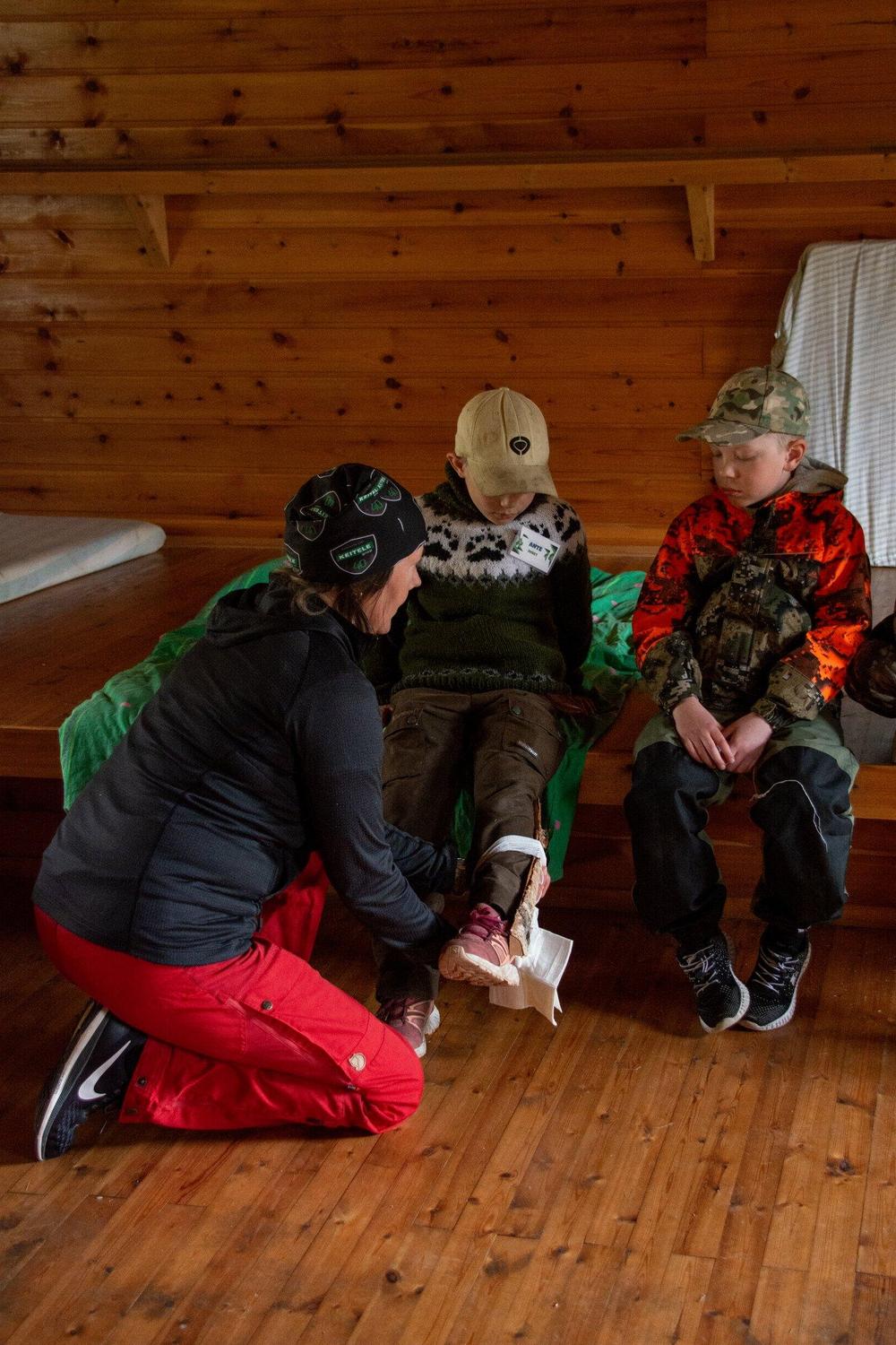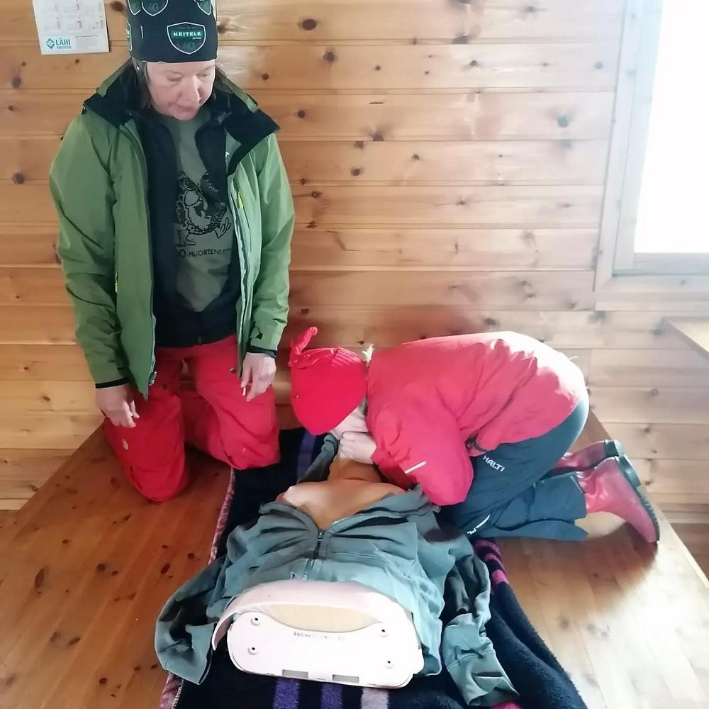 Ensiapurastilla Anna-Maija Kokkoniemen johdolla opeteltiin ensiavun perusasioita haavojen sitomisesta ihan elvytykseen asti. 112-sovellus löytyi jo monelta puhelimesta ja sen käytöstä puhuttiin paljon, samoin hätänumeroon soittamisesta. Rastilla myös käännettiin "tajuttomia" ryhmänohjaajia kylkiasentoon, mikä kävi leiriläisiltä kokoerosta huolimatta oikein näppärästi, kunhan ensin opeteltiin oikea tekniikka.