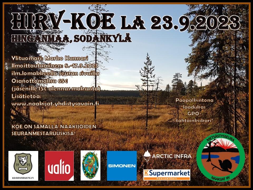 Naakijoiden HIRV-koe ja samalla seuranmestaruuskisa. Ylituomarina Marko Kunnari. Max. 15 koiraa, etusija seuran jäsenten koirilla, loput osallistujat arvotaan kaikista määräaikana ilmoittautuneista. Ilmoittautuminen 8.-17.9.2023.
