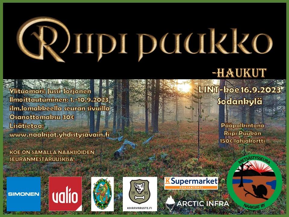 LINT-koe Riipi Puukko-haukut ja samalla seuranmestaruuskisa. Ylituomarina Jussi Sorjonen. Max. 10 koiraa, etusija seuran jäsenten koirilla, loput osallistujat arvotaan kaikista määräaikana ilmoittautuneista. Ilmoittautuminen 1.-10.9.2023.